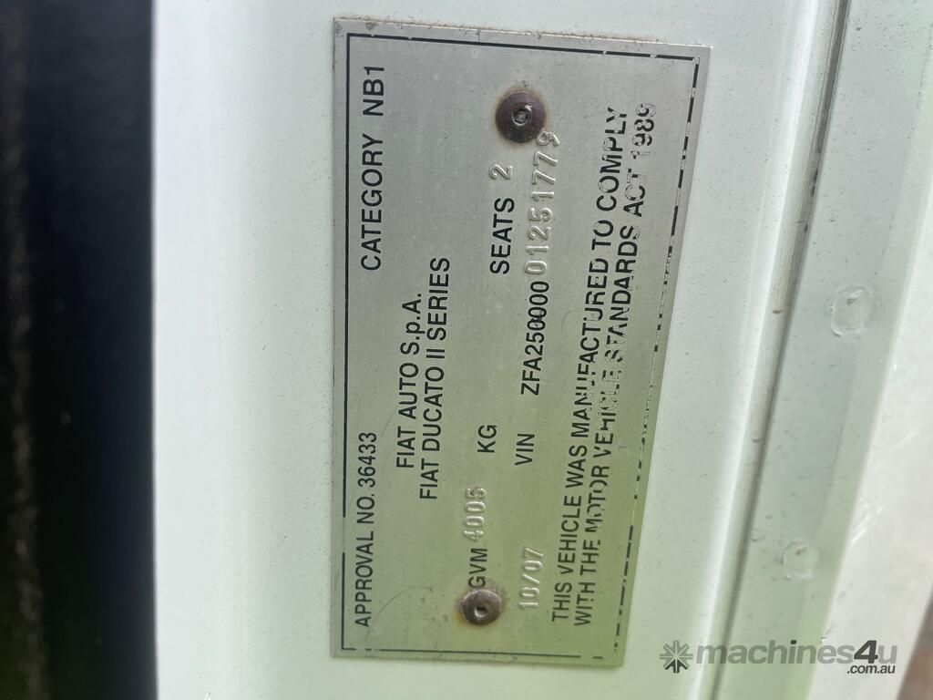CP: 10/2007,Fiat,Ducato,Motor Home,Manual,Leaf Spring Suspension,F1CE0481D,4 Cyl,Diesel,Direct Injection,6 Gears,Odometer not visible,Hourmeter not visible,Colour: White,Rego. No: NP(BEI09N), Unregistered NSW,VIN: ZFA1779,GVM: 4005,Sold with No Plates,WOVR Status: WOVR N/A,Incident Type: Impact