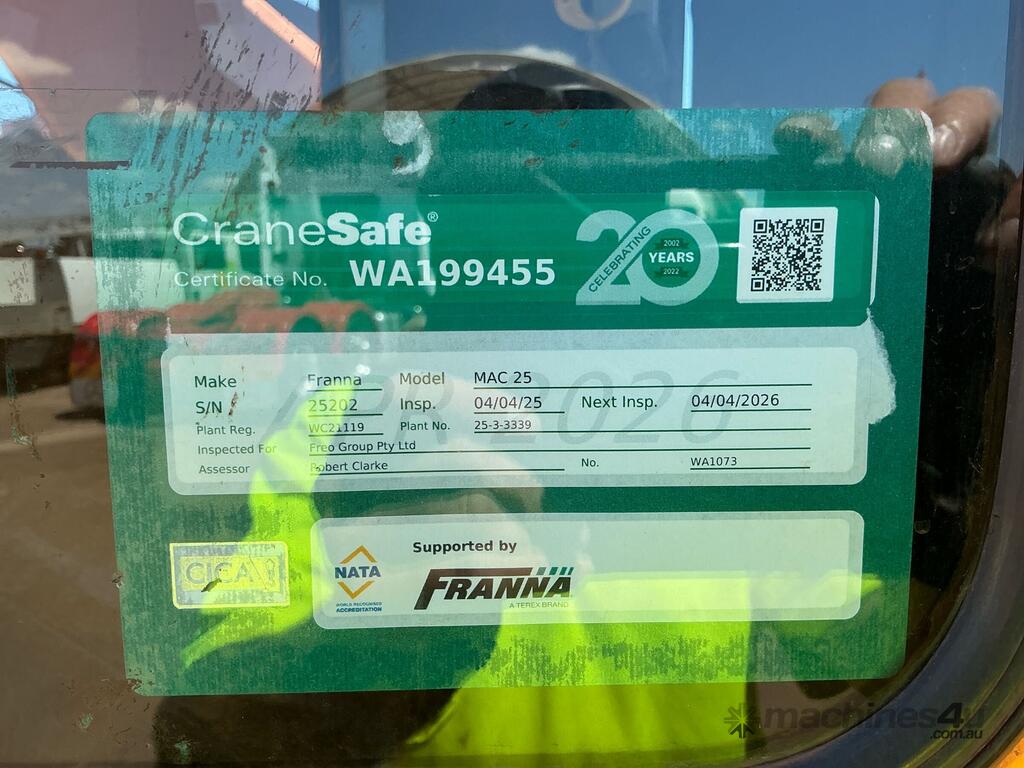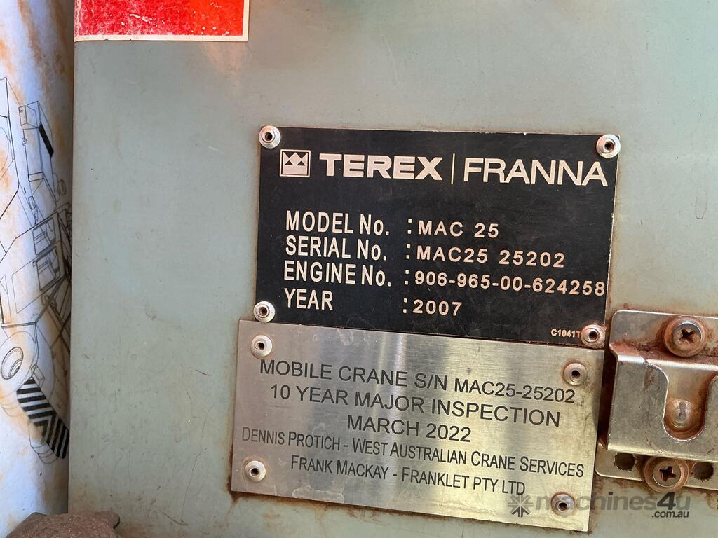 CP: 01/2007,Built: 01/2007,Franna,MAC25,Pick & Carry Crane,6 Cyl,Diesel Turbo,111397 (Kms. Showing on Odometer),26214 (Hrs. Showing on Hour meter),Colour: Orange,Rego. No: XQ13WK NAT,Serial No: MAC25 25202,Sold with No Plates,Key No: 98