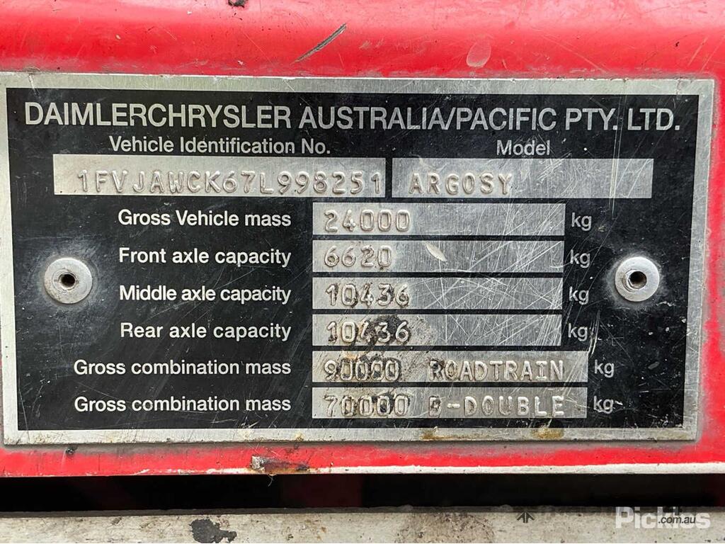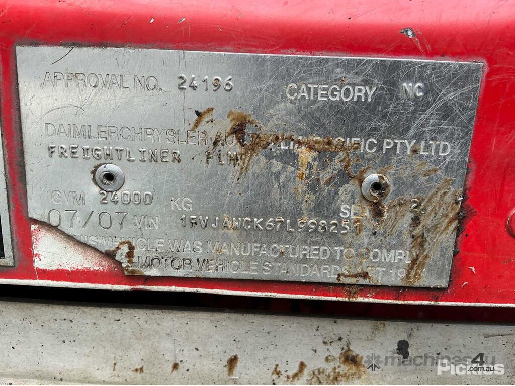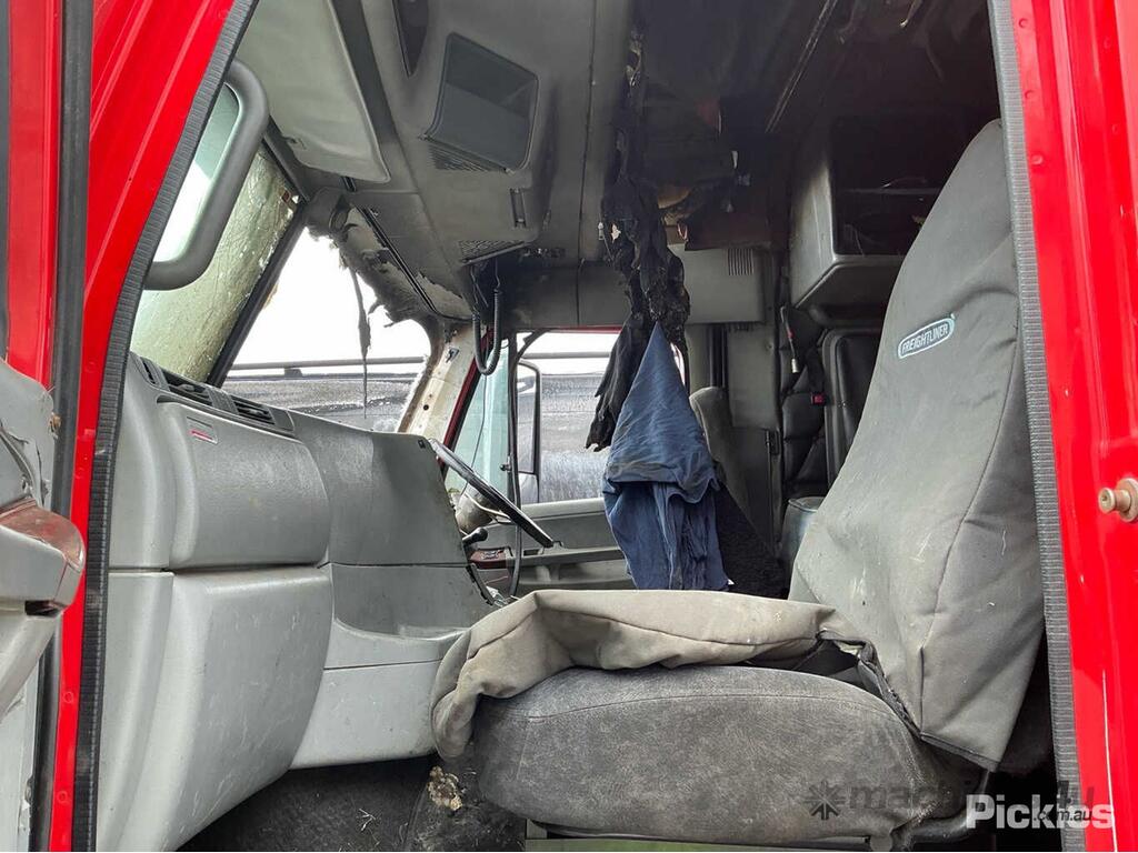 CP: 07/2007,Freightliner,Argosy FLH,Prime Mover,Automatic,Airbag ,6 Cyl,Diesel,Turbo,Odometer not visible,Hourmeter not visible,Colour: Red,Rego. No: NP(XV44JI), Unregistered NAT,VIN: 1FVJAWCK67L998251,Length: 6.3 m,GVM: 24000,GCM: 70000,Sold with No Plates,WOVR Status: WOVR N/A,Incident Type: Fire