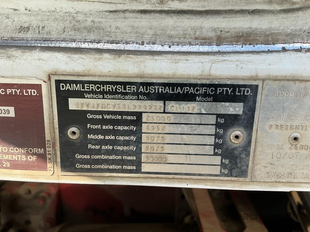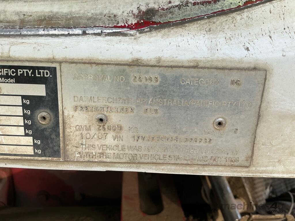CP: 10/2007,Freightliner,FLX,Prime Mover,Odometer not visible,Hourmeter not visible,Colour: White,Unregistered,VIN: 1FVJF0CV58L998932,Length: 24 ft,GVM: 24000,GCM: 50000,Sold with No Plates,WOVR Status: WOVR N/A,Incident Type: Malicious