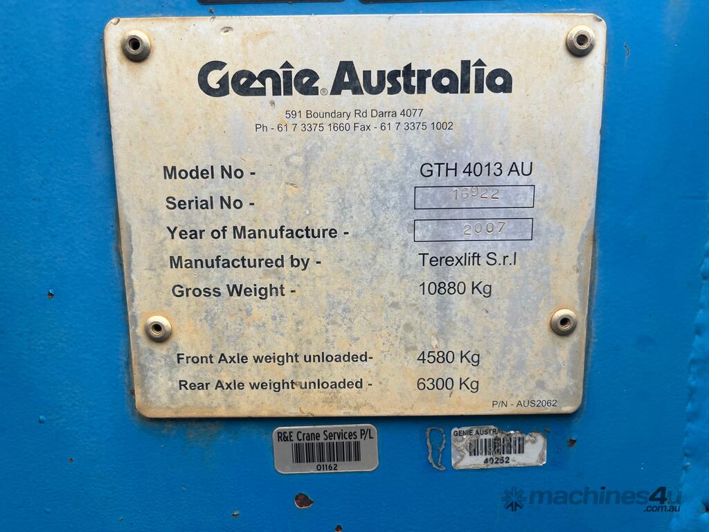 CP: CIRCA 2007,Genie,GTH 4013 AU,Telehandler,Odometer not visible,4851 (Hrs. Showing on Hour meter),Colour: Blue,Rego. No: NP(54312C), Unregistered QLD,Serial No: 16922,Sold with No Plates