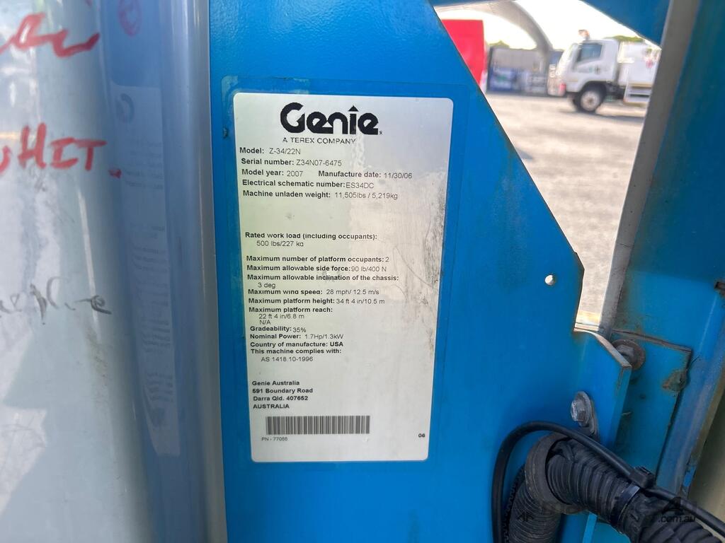 CP: CIRCA 2007,Genie,Z34/22,Boom Lift,Diesel,Odometer not visible,97 (Hrs. Showing on Hour meter),Colour: Blue,Unregistered,Serial No: Z34N07-6475,Sold with No Plates,Key No: 120