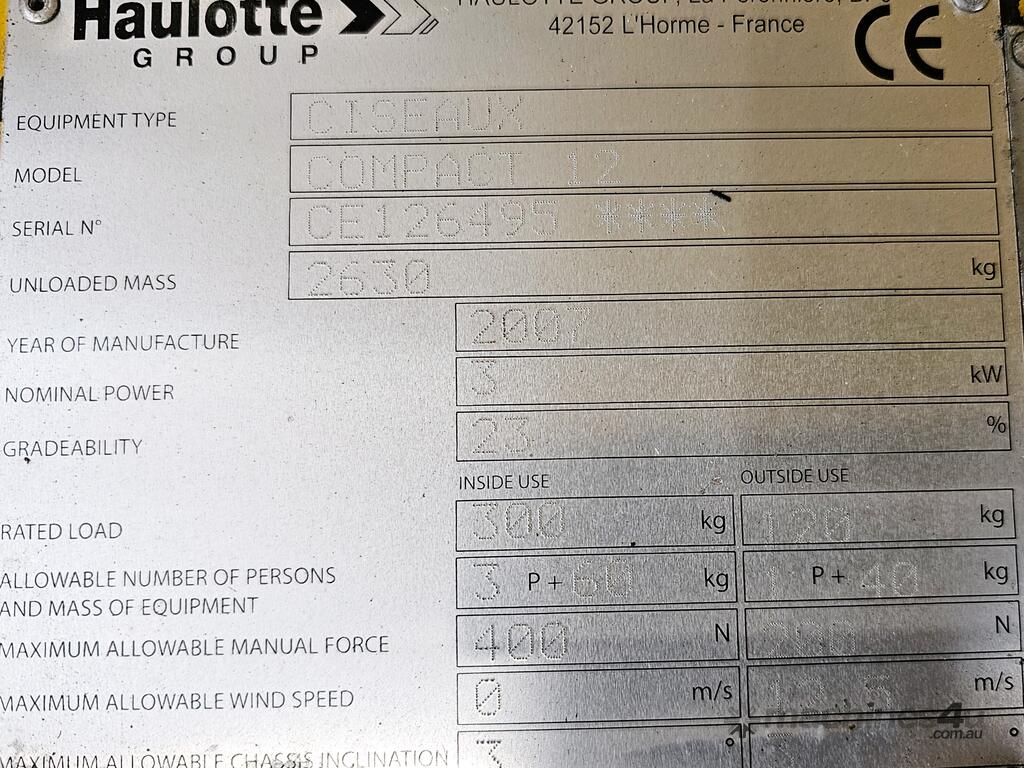 The Haulotte Compact 12 is a self propelled scissor lift that is designed to safely raise you up on flat level concrete surfaces. It is only 1.2m wide with a stowed height of 2.39m making this machine compact enough to fit through many narrow spaces while allowing for a maximum raised deck of 9.98m.