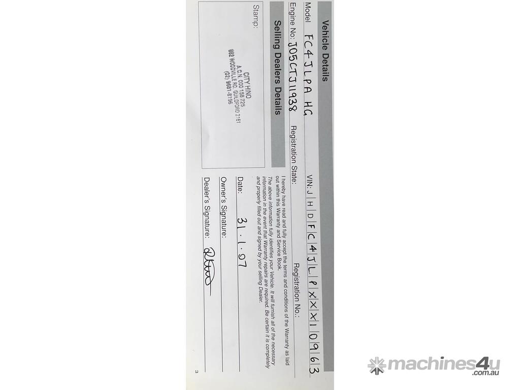 CP: 01/2007,Hino,FC4J,Curtainsider Day Cab,Manual,Springs,Engine #: J05CTJ11938,4 Cyl,Diesel Turbo,6 Gears,752562 (Kms. Showing on Odometer),Hourmeter not visible,Colour: White,Rego. No: AN38YZ NSW,Rego expiry: 07/02/2026,VIN: JHDFC4JLPXXX10963,Key No: 193E,Length: 9 m,GVM: 10400,GCM: 15000,Sold with No Plates,Key No: 193E