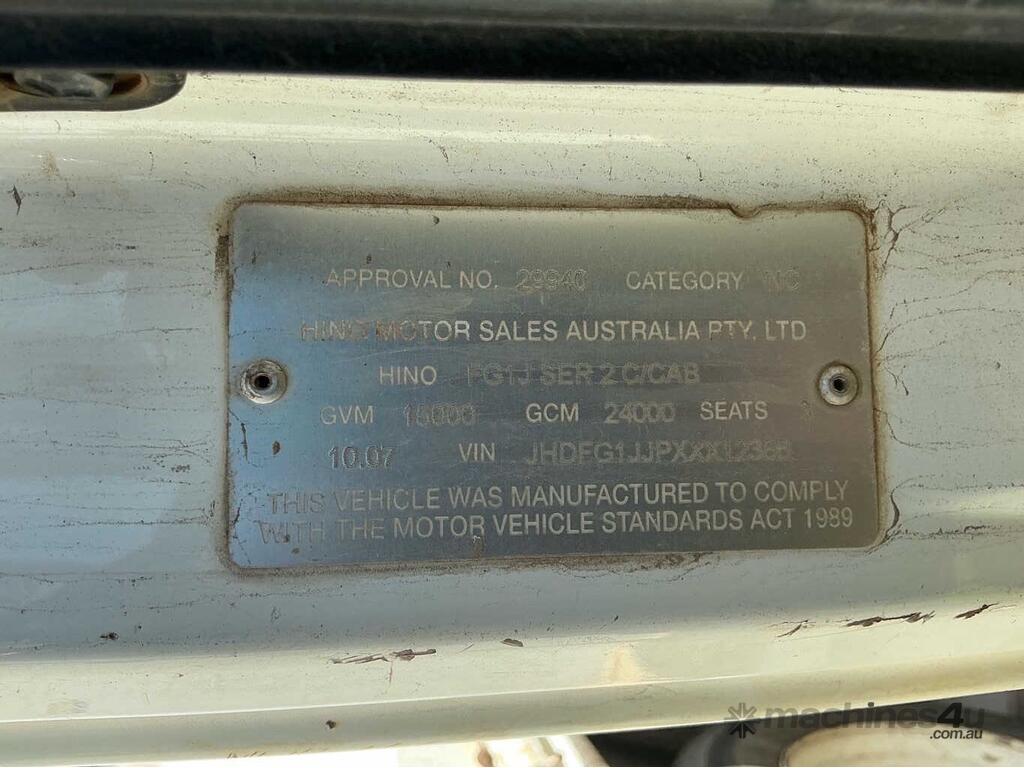 CP: 10/2007,Hino,FG1J,Water Tanker,Manual,Diesel,Odometer not visible,Hourmeter not visible,Colour: White,Rego. No: XV69DT VIC,VIN: JHDFG1JJPXXX12386,Length: 23 ft,GVM: 15000,GCM: 24000,Sold with No Plates,WOVR Status: WOVR N/A,Incident Type: Malicious