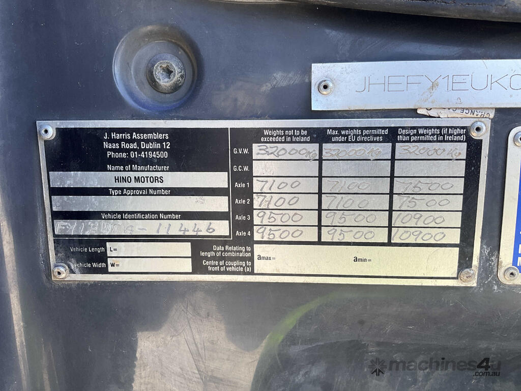CP: CIRCA 2007,Hino,FY 700,Tipper,Manual,Leaf Spring Suspension,Engine #: E13CTM12294,6 Cyl,Diesel,16 Gears,510703 (Kms. Showing on Odometer),Hourmeter not visible,Colour: Blue,Rego. No: XP20OA NAT,Rego expiry: 04/04/2026,VIN: JHEFY1EUK00011446,Key No: 100E,Length: 8.3 m,GVM: 34000,GCM: 54000,Sold with No Plates,Key No: 100E