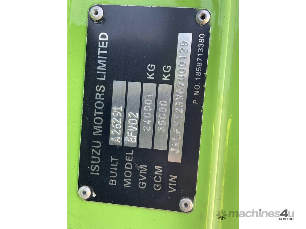 CP: 01/2007,Isuzu,F3 FVZ,Curtain Sider,Manual,Airbag Suspension,6 Cyl,Diesel Turbo,15 Gears,565484 (Kms. Showing on Odometer),Hourmeter not visible,Colour: Green,Rego. No: A059TJ NSW,Rego expiry: 19/03/2026,VIN: JALFVY23V67000129,Key No: 445E,Length: 11.1 m,GVM: 24000,GCM: 36000,Sold with No Plates,Key No: 445E