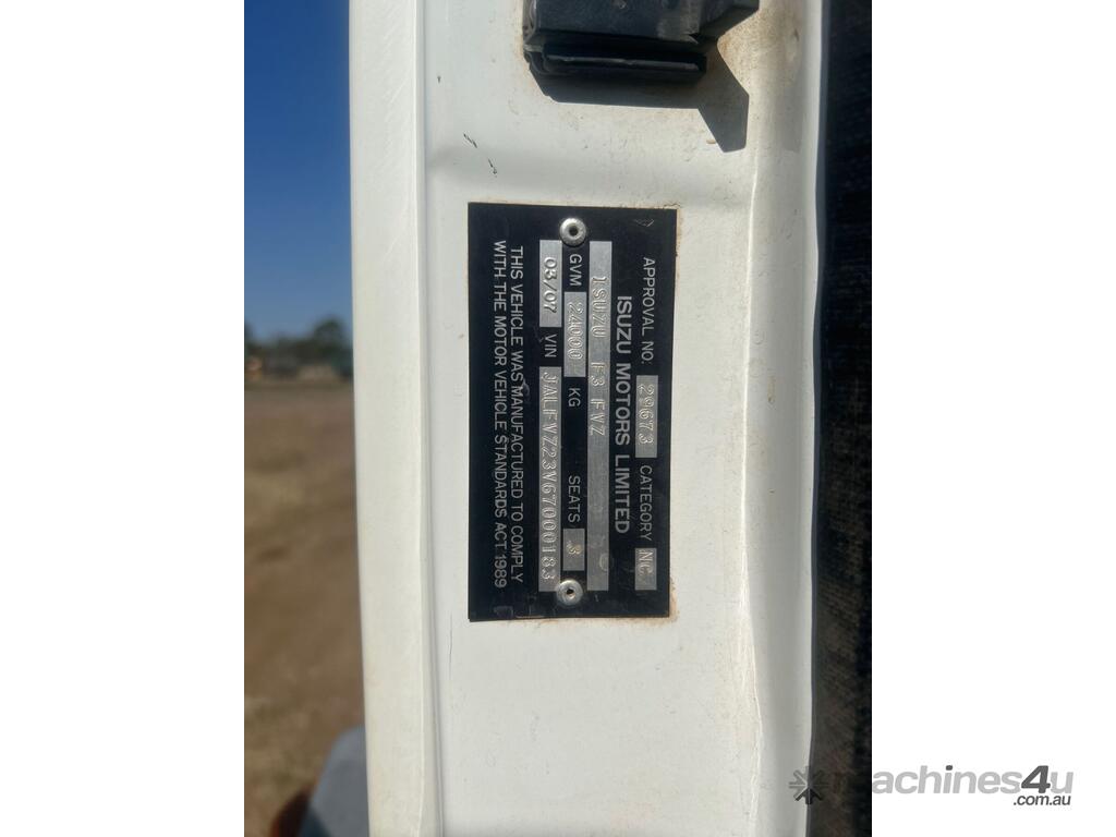 CP: 03/2007,Isuzu,FVZ 1400,EWP,Manual,Spring Suspension,6 Cyl,Diesel,259010 (Kms. Showing on Odometer),7716 (Hrs. Showing on Hour meter),Colour: White,Rego. No: NP(329KFW), Unregistered QLD,VIN: JALFVZ23V67000183,Key No: T22,Length: 10.2 m,GVM: 24000,GCM: 36000,Sold with No Plates,Key No: T22