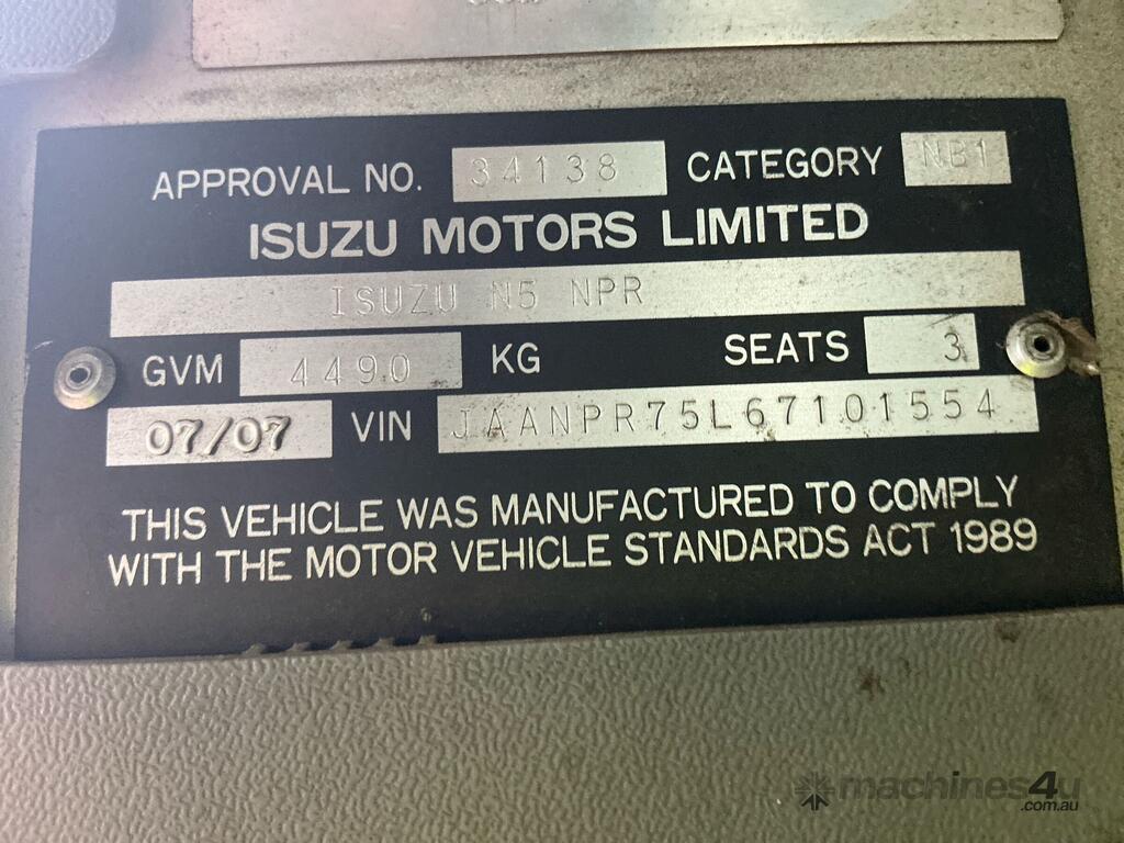 CP: 07/2007,Isuzu,NPR 200,Curtain Sider,Manual,Diesel,691985 (Kms. Showing on Odometer),Hourmeter not visible,Colour: White,Rego. No: NP(XYZ548), Unregistered VIC,VIN: JAANPR75L67101554,Length: 21 ft,GVM: 4490,GCM: 7990,Sold with No Plates,WOVR Status: WOVR N/A,Incident Type: Impact