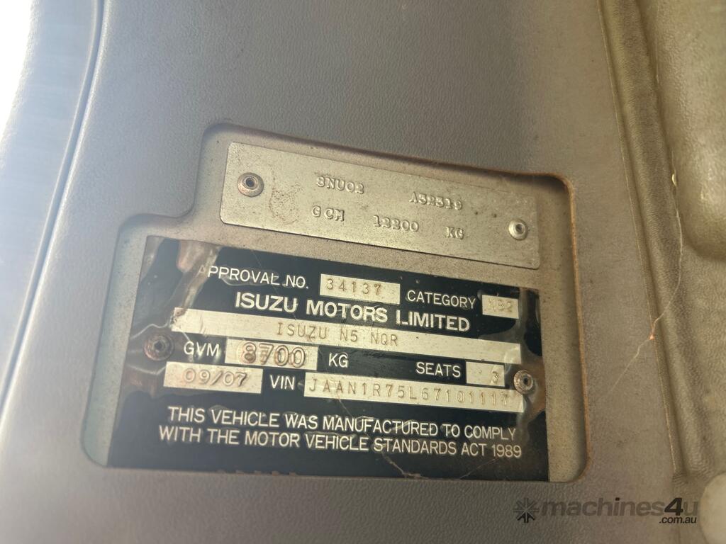 CP: 09/2007,Isuzu,NQR450,Chipper Tipper Day Cab,Manual,Spring,4 Cyl,Diesel,6 Gears,236911 (Kms. Showing on Odometer),Hourmeter not visible,Colour: White,Unregistered,VIN: JAAN1R75L67101117,Key No: 12,GVM: 8700,GCM: 12200,Sold with No Plates,Key No: 12