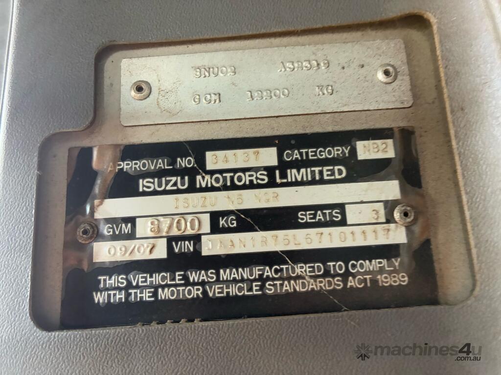 CP: 09/2007,Isuzu,NQR450,Chipper Tipper,Manual,Spring,4 Cyl,Diesel,237488 (Kms. Showing on Odometer),Hourmeter not visible,Colour: White,Rego. No: 660WFO QLD,VIN: JAAN1R75L67101117,Key No: 20,GVM: 8700,GCM: 12200,Sold with No Plates,Key No: 20