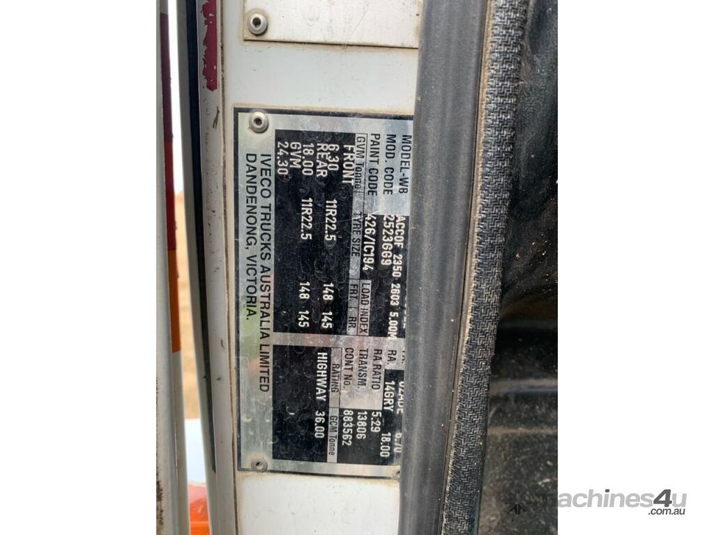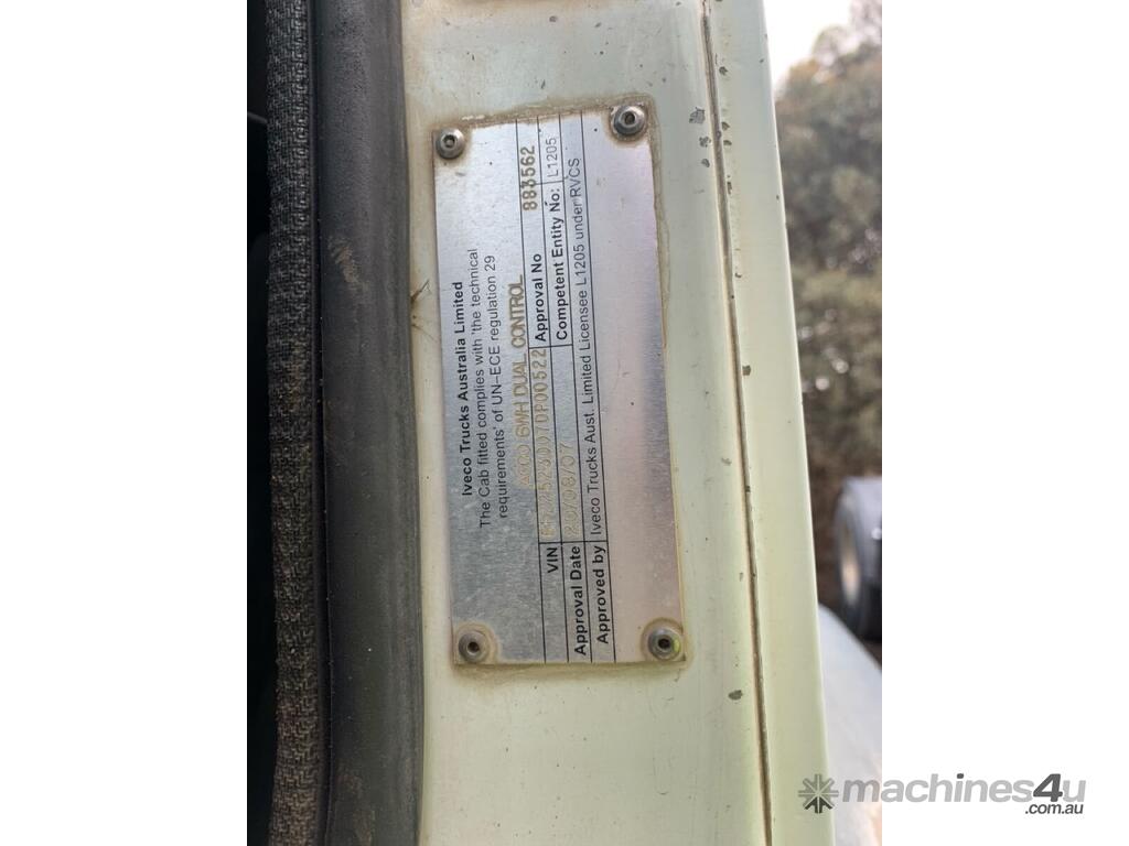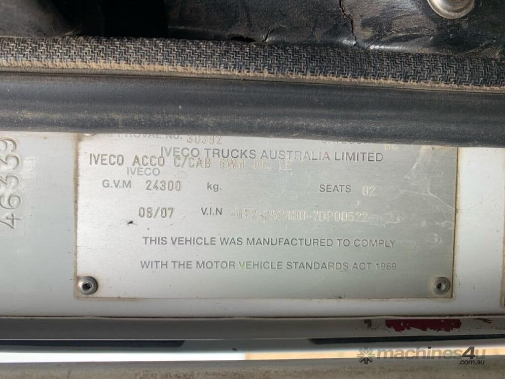CP: 08/2007,Iveco,ACCO,Cab Chassis,Automatic,Airbag Suspension,Cummins,43070 (Kms. Showing on Odometer),25090 (Hrs. Showing on Hour meter),Unregistered,VIN: 6F22523007DP00522,GVM: 24300,GCM: 36000,Sold with No Plates,WOVR Status: WOVR N/A,Incident Type: Not Applicable