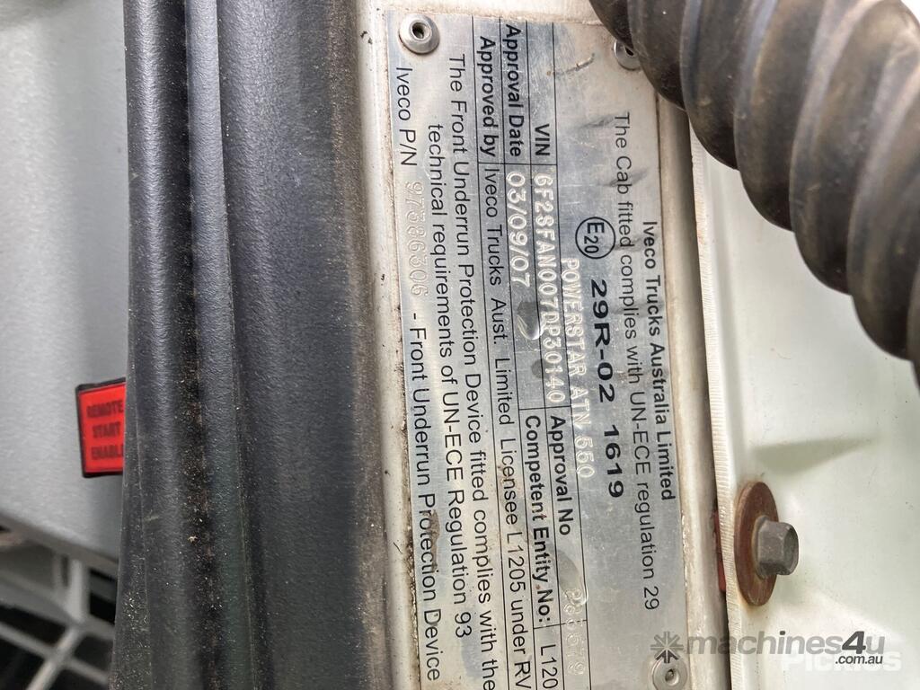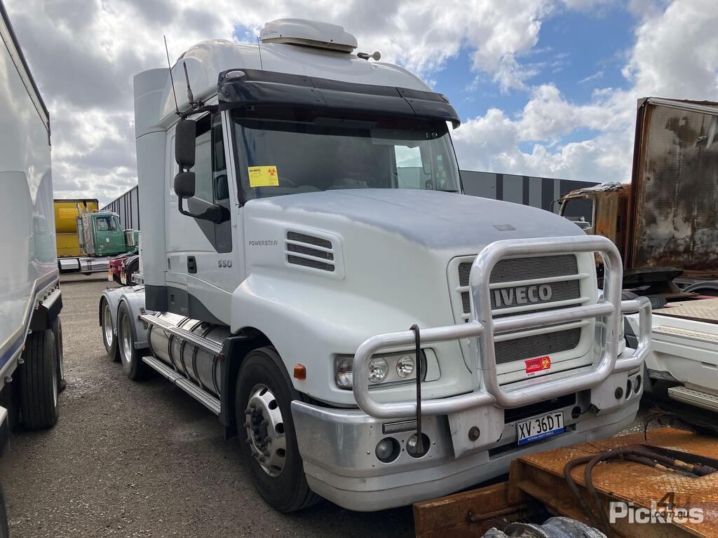 CP: CIRCA 2007,Iveco,Powerstar,Prime Mover,Automatic,Diesel,Odometer not visible,Hourmeter not visible,Colour: White,Rego. No: NP(XV36DT), Unregistered NAT,VIN: 6F2SFAN007DP30140,Sold with No Plates,WOVR Status: WOVR N/A,Incident Type: Impact