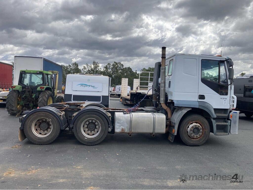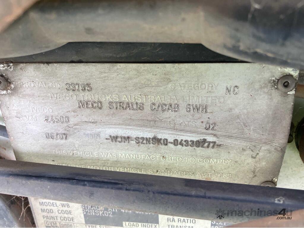 CP: 06/2007,Iveco,Stralis ATI435,Prime Mover,Automatic,Air Bag Suspension ,Engine #: 97471,6 Cyl,Diesel,805085 (Kms. Showing on Odometer),Hourmeter not visible,Colour: White,Rego. No: NP(XP89EC), Unregistered,VIN: WJMS2NSK,Length: 7.5 m,GVM: 24500,GCM: 50000,Sold with No Plates,WOVR Status: WOVR N/A