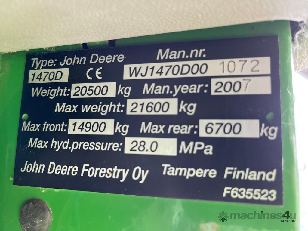 CP: CIRCA 2007,John Deere,1470D,Log Harvester,Odometer not visible,4680 (Hrs. Showing on Hour meter),Unregistered,Serial No: WJ1470D001072,Sold with No Plates
