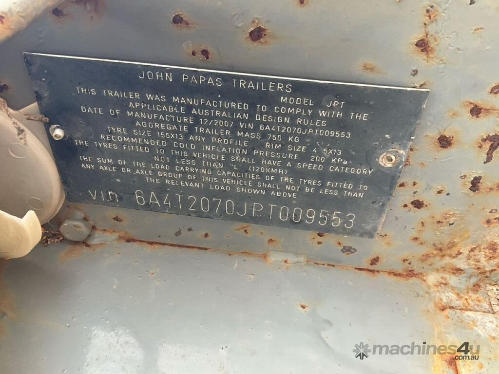 CP: CIRCA 2007,Built: 12/2007,John Papas Trailers,JPT,Single Axle Box Trailer,Hubometer not visible,Colour: Silver,Rego. No: 1TIP237 WA,VIN: 6A4T2070JPT009553,Sold with No Plates