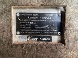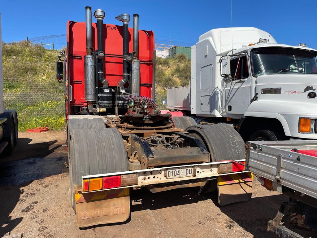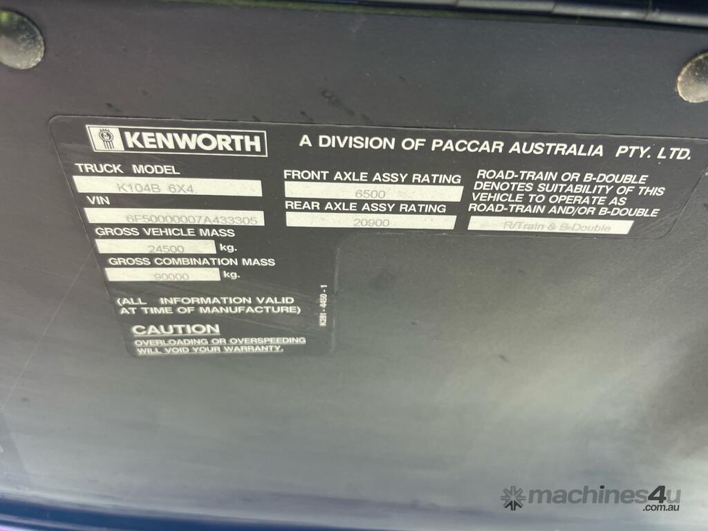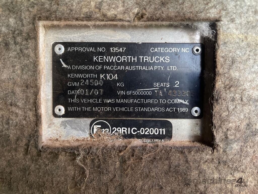 CP: 01/2007,Kenworth,K104B Aerodyne,Prime Mover Sleeper Cab,Automatic,Airbag,Cat C15,6 Cyl,Diesel Turbo,18 Gears,751808 (Kms. Showing on Odometer),Hourmeter not visible,Colour: Red,Rego. No: NP(0104DU), Unregistered WA,VIN: 6F50000007A433305,Key No: 306,GVM: 24500,GCM: 90000,Sold with No Plates,Key No: 306