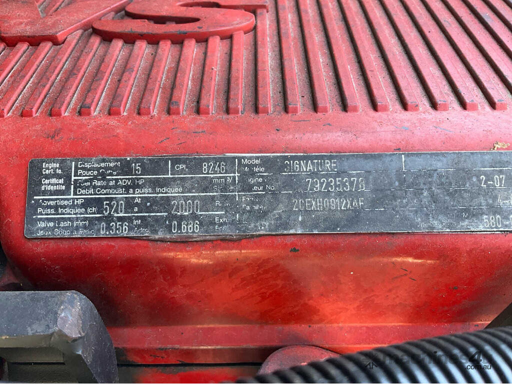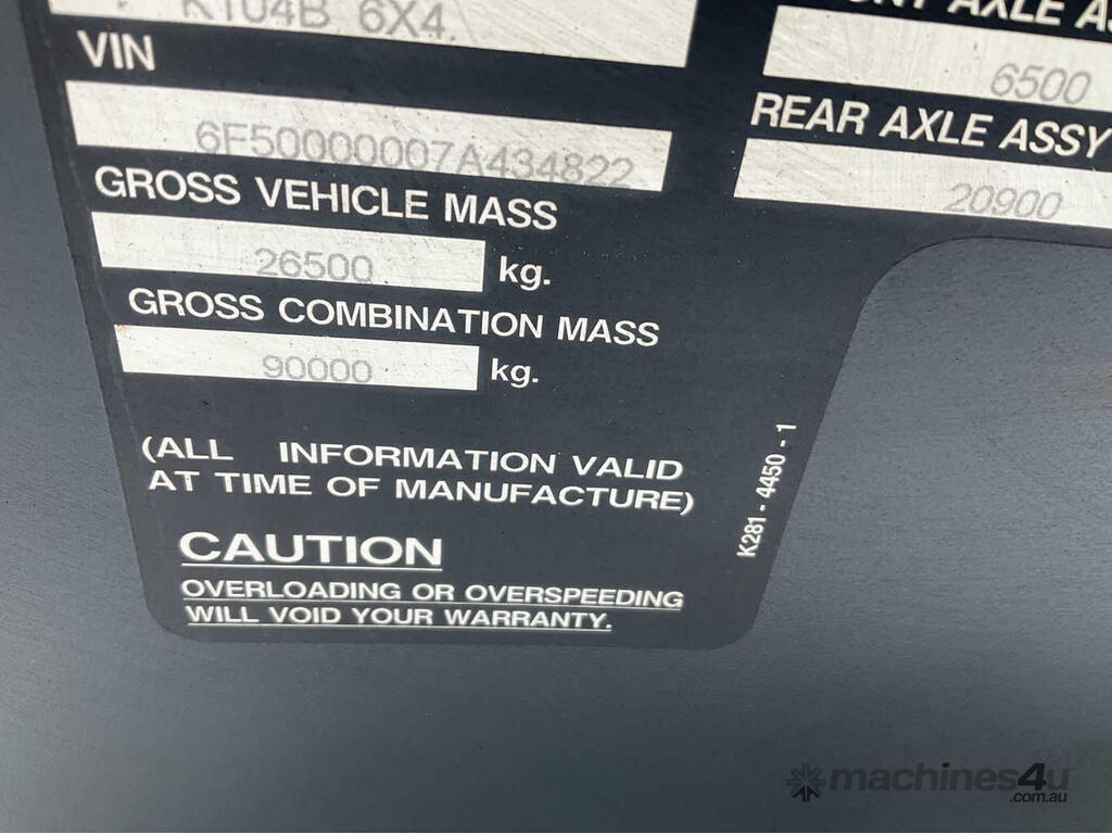 CP: 05/2007,Kenworth,K104B,Prime Mover Sleeper Cab,Automated Manual Transmission,Airbags ,Engine #: 79235378,Cummins Signature,6 Cyl,Diesel Turbo,706020 (Kms. Showing on Odometer),39189 (Hrs. Showing on Hour meter),Colour: White,Rego. No: NP(XP61NF), Unregistered NSW,VIN: 6F50000007A434822,Key No: 444E,Length: 6.6 m,GVM: 26500,GCM: 90000,Sold with No Plates,Key No: 444E