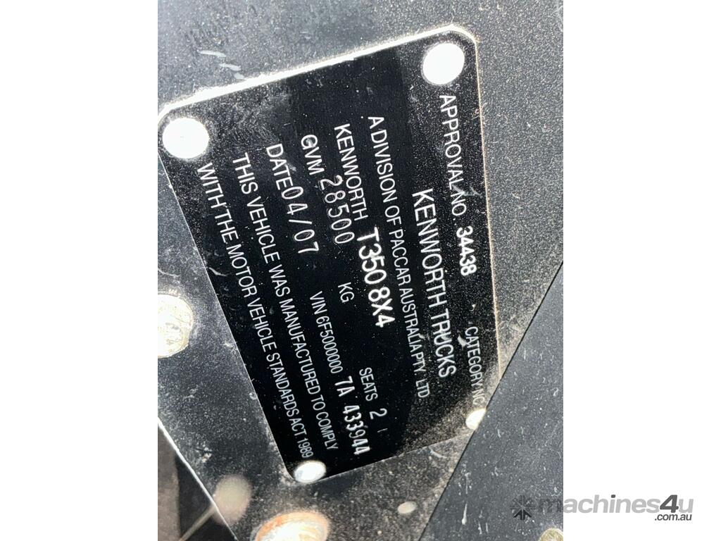 CP: 04/2007,Kenworth,T350,Concrete Mixer,Automatic,Diesel,Odometer not visible,Hourmeter not visible,Colour: White,Rego. No: NP(UTL369), Unregistered VIC,VIN: 6F50000007A433944,Length: 28 ft,GVM: 28500,Sold with No Plates,WOVR Status: WOVR N/A,Incident Type: Impact