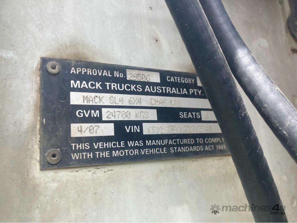 CP: 04/2007,Mack,Superliner,Prime Mover,Manual,Airbag,6 Cyl,Diesel,Odometer not visible,Hourmeter not visible,Colour: Green,Rego. No: 03SER,VIN: 6FML07E697D713540,GVM: 24700,GCM: 70000,Sold with No Plates,WOVR Status: WOVR N/A,Incident Type: Impact