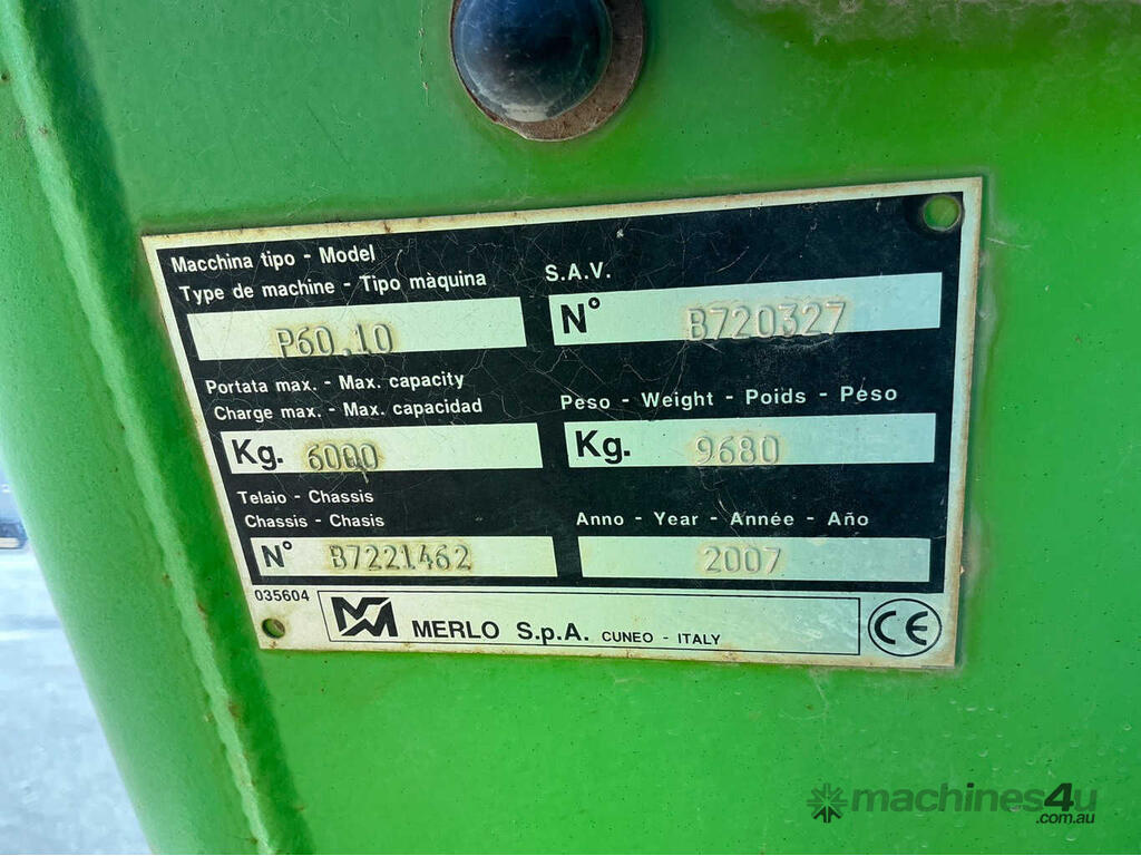 CP: CIRCA 2007,Merlo,P60.10,Telehandler,Engine #: RG81391U382317P,4 Cyl,Diesel,Odometer not visible,3084 (Hrs. Showing on Hour meter),Colour: Green,Rego. No: 1QBH635 WA,Serial No: B7221462,ROPS No: undefined,FOPS No: undefined,Sold with No Plates,Key No: 110