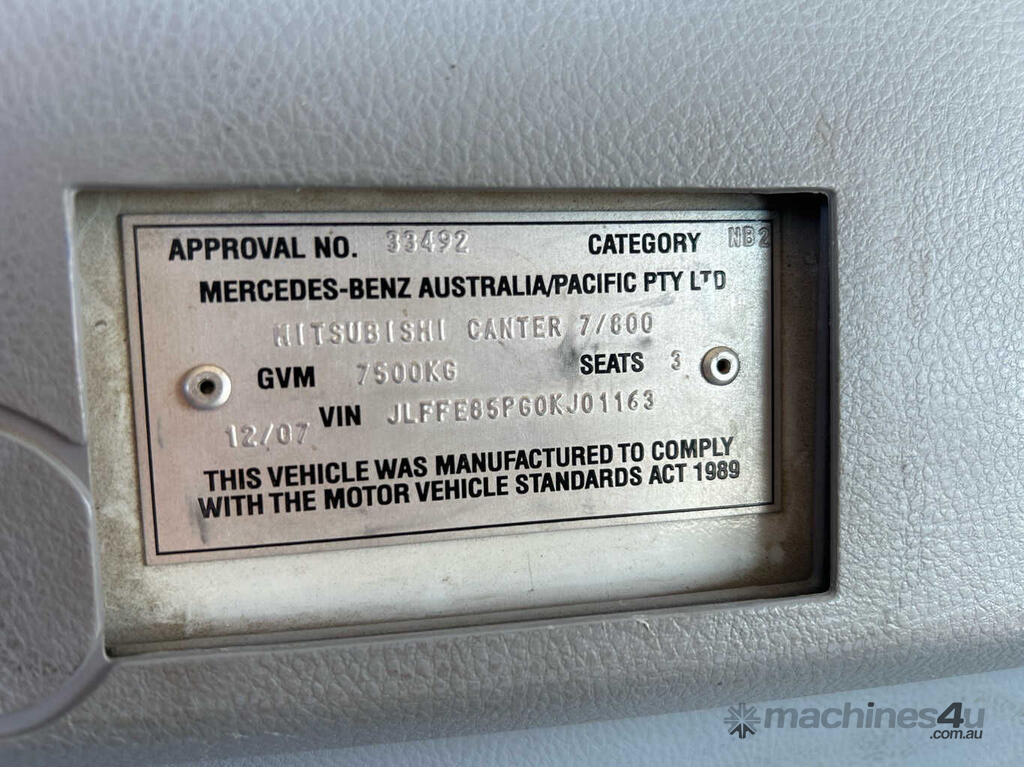 CP: 12/2007,Mitsubishi,Canter 7/800,Tipper,Manual,Engine #: 4D34L60850,Diesel,5 Gears,149167 (Kms. Showing on Odometer),Hourmeter not visible,Colour: White,Rego. No: A36PN TAS,Rego expiry: 01/07/2026,VIN: JLFFE85PG0KJ01163,Length: 6.3 m,GVM: 7500,GCM: 11000,Plates to All