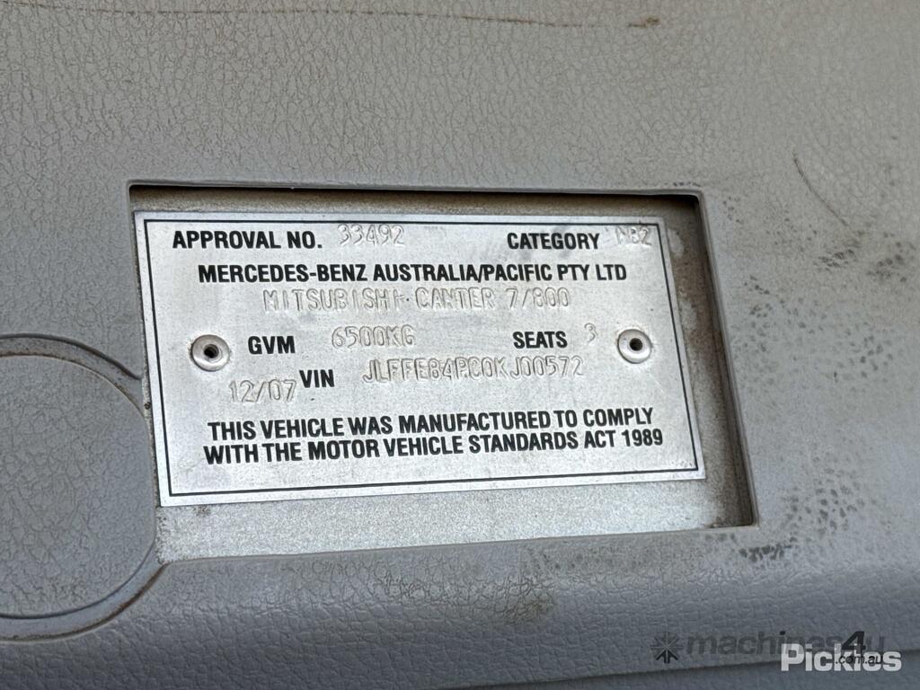 CP: 12/2007,Mitsubishi Fuso,Canter 7/800,Tipper,Manual,Spring Suspension ,4 Cyl,Diesel Turbo,5 Gears,226752 (Kms. Showing on Odometer),Hourmeter not visible,Colour: White,Rego. No: AW04JL NSW,VIN: JLFFE84PC0KJ00572,GVM: 6500,GCM: 10000,Sold with No Plates