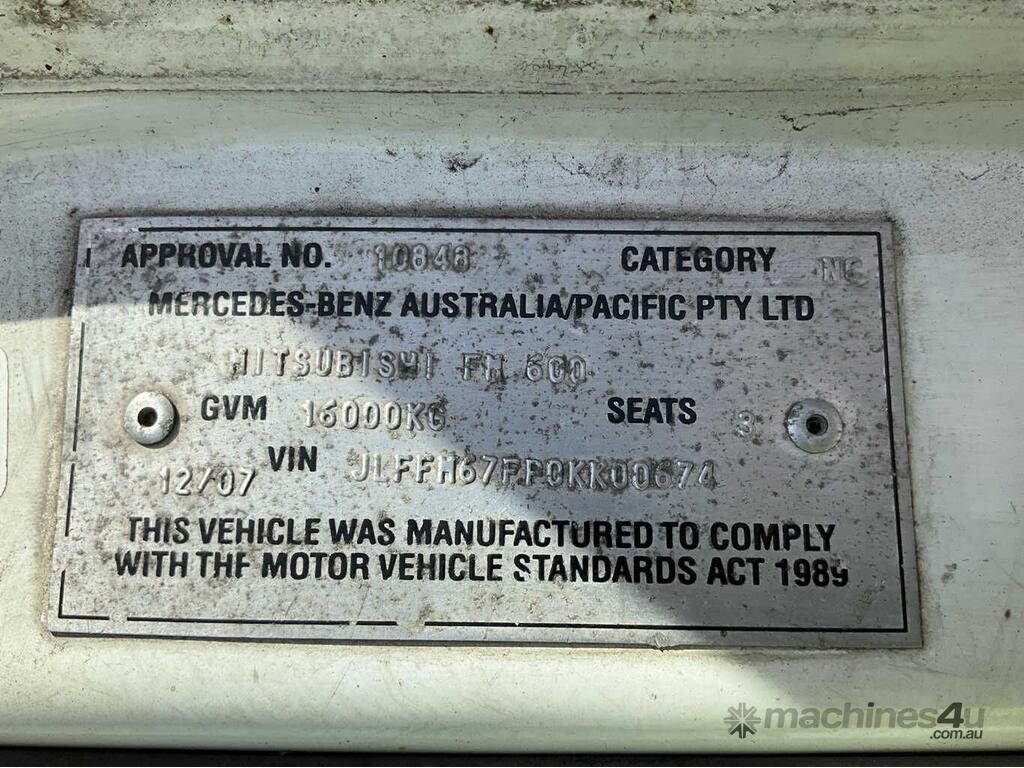 CP: 12/2007,Mitsubishi Fuso,Fighter FM600,Curtainsider Day Cab,Manual,Aibag,6M60-1AT1,6 Cyl,Diesel Turbo,6 Gears,572579 (Kms. Showing on Odometer),Hourmeter not visible,Colour: White,Unregistered,VIN: JLFFM67FP0KK00674,Key No: 515S,Length: 10.7 undefined,GVM: 16000,GCM: 25000,Sold with No Plates,Key No: 515S