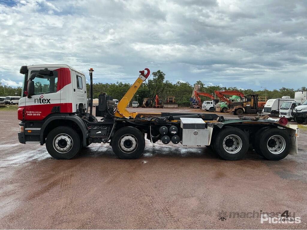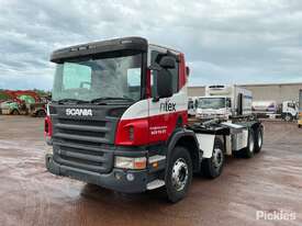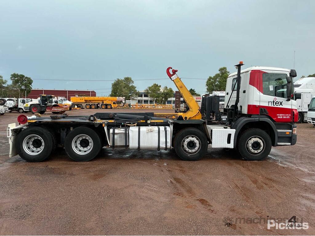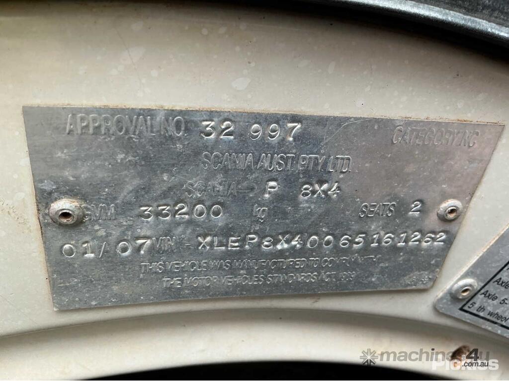 CP: 01/2007,Scania,P310,Hook Bin Truck,Manual,Airbag ,Engine #: DC,Volvo DC9,6 Gears,853283 (Kms. Showing on Odometer),22474 (Hrs. Showing on Hour meter),Colour: White,Rego. No: CF66ZF NT,VIN: XLEP8X2,Length: 9 m,GVM: 33200,GCM: 45000,Sold with No Plates