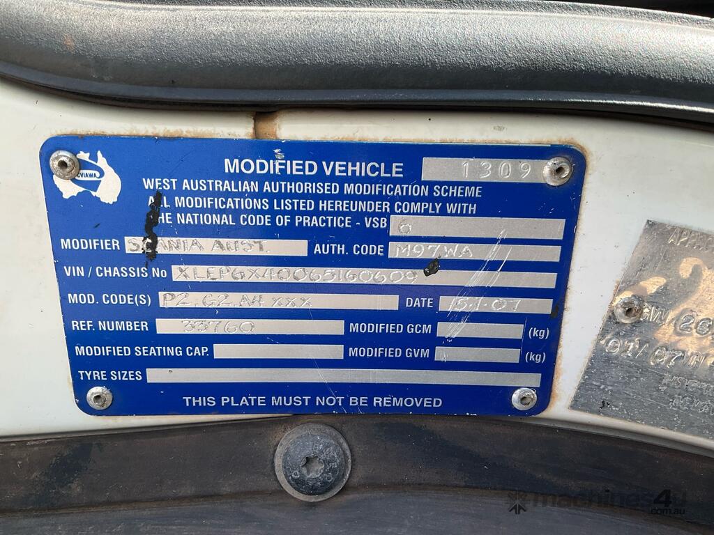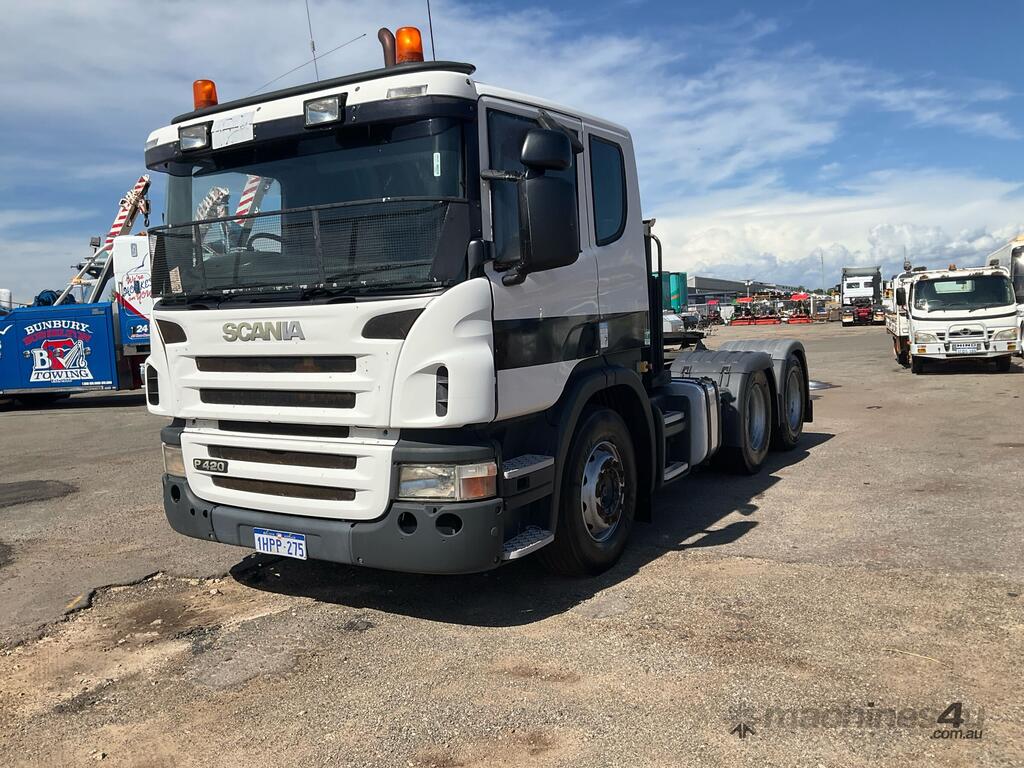 CP: 01/2007,Scania,P420,Prime Mover Day Cab,Automatic,Air Bag Suspension ,6 Cyl,Diesel,547387 (Kms. Showing on Odometer),Hourmeter not visible,Colour: White,Rego. No: NP(1HPP275), Unregistered WA,VIN: XLEP6X9,Key No: 563,GVM: 26100,GCM: 70000,Sold with No Plates,Key No: 563