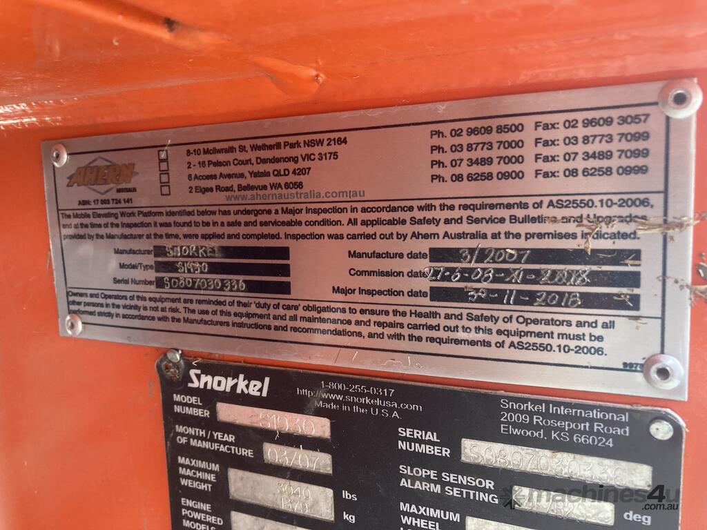 CP: 03/2007,Built: 03/2007,Snorkel,S1930,Scissor Lift,Electric,Odometer not visible,145 (Hrs. Showing on Hour meter),Colour: Orange,Unregistered,Serial No: S,Sold with No Plates,Key No: No Key