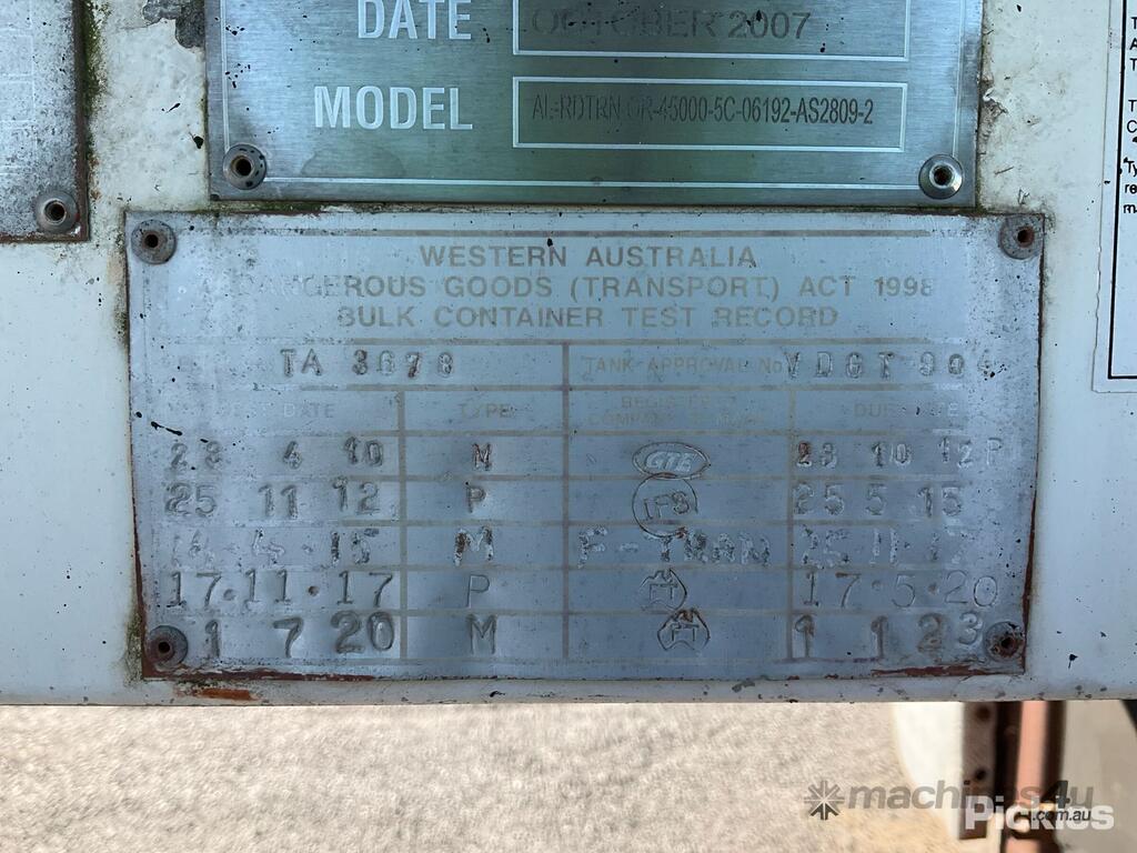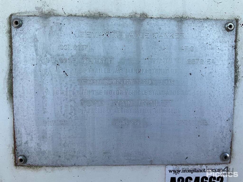 CP: 10/2007,Built: 10/2007,Tieman,Tri Axle Fuel Tanker,Hubometer not visible,Colour: White,Unregistered,VIN: 6B9TA36787MAC1678,Serial No: TA3678,Sold with No Plates