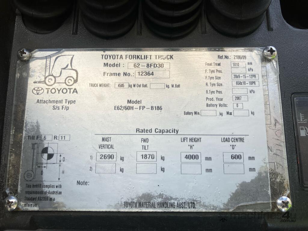 CP: CIRCA 2007,Toyota,62-8FD30,2 Stage Forklift,Engine #: 1DZ0172520,4 Cyl,Diesel,Odometer not visible,17984 (Hrs. Showing on Hour meter),Colour: Orange,Unregistered,Serial No: 12364,ROPS No: undefined,Sold with No Plates