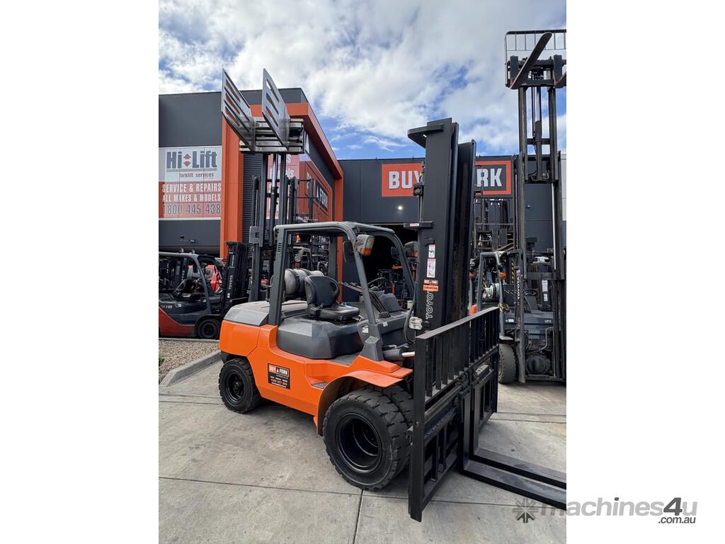 Make- Toyota Year- 2016 Model Model- 8FD40N 5,000 Hours 2400mm collapsed height Tynes- 1070mm Lift Height- 4000mm standard 2 stage mast Capacity- 4000KG Nominal Tyres- Solid Tyres Side Shift fork positioners Fuel- Diesel....