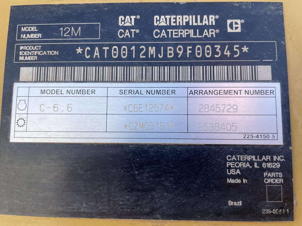 CP: CIRCA 2008,Caterpillar,12M,Articulated Grader,Engine #: C6E12574,6 Cyl,Odometer not visible,15937 (Hrs. Showing on Hour meter),Colour: Yellow,Rego. No: NP(S57SPW), Unregistered SA,VIN: CAT0012MJB9F00345,Sold with No Plates