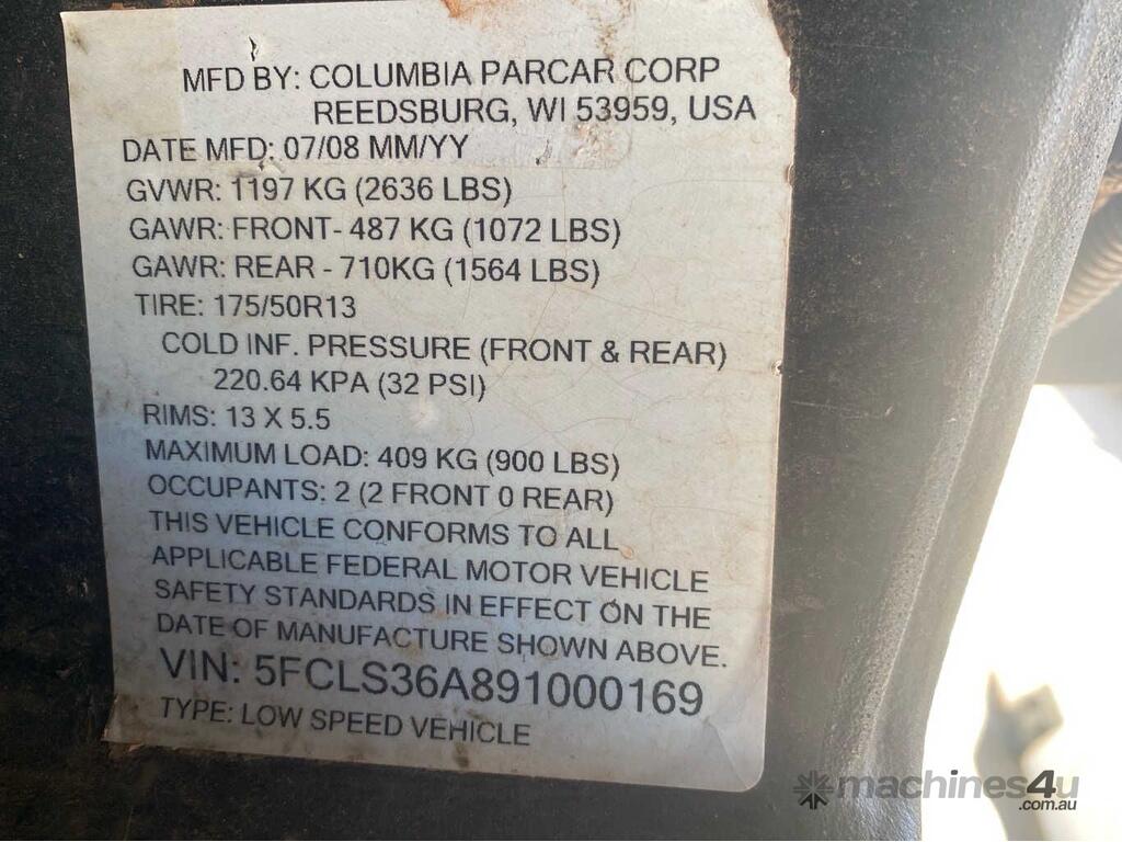 CP: CIRCA 2008,Built: 07/2008,Columbia,Electric Utility Vehicle,Electric,Odometer not visible,Hourmeter not visible,Colour: White,Unregistered,VIN: 5FCLS36A,Serial No: 5FCLS36A,Sold with No Plates