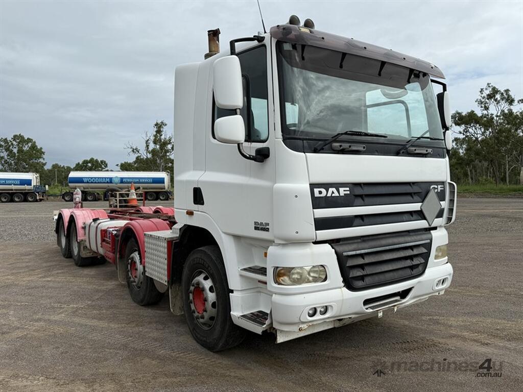2008 DAF 85.460 8x4 CAB CHASSIS. VIN XLRAD85MC7E799716. New batteries. Isolators. Kenworth Airglide suspension. Ringfeeder. UHF. Bartlett tow bar rating of 21,500kgs. Double chassis rails. Diff locks. Ex fuel truck, tank and pumping gear have been removed. Located Townsville, QLD.
