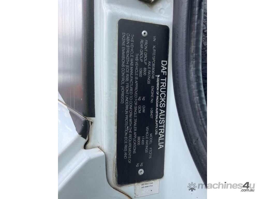 CP: 05/2008,DAF,CF7585,Table Top,Automatic,airbags ,6 Cyl,Diesel,Odometer not visible,Hourmeter not visible,Colour: White,Rego. No: NP(XB86EN), Unregistered QLD,VIN: XLRTE75PC8E806248,GVM: 17400,GCM: 38000,Sold with No Plates,WOVR Status: WOVR N/A,Incident Type: Fire