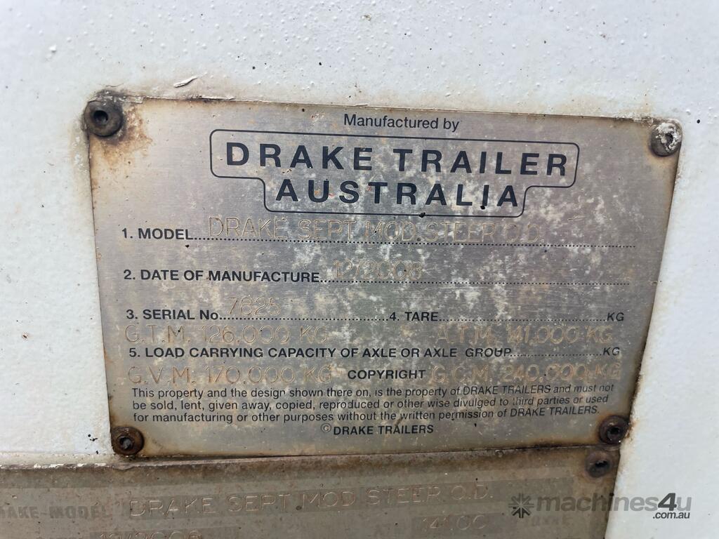 CP: 12/2008,Drake,Sept Mod Steer OD,7x8 Modular Steerable Low Loader,Hubometer not visible,Colour: White,Unregistered,VIN: 6T9T25ABF80AKG115,Sold with No Plates