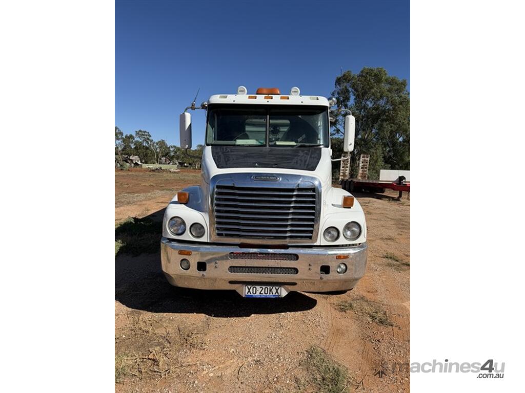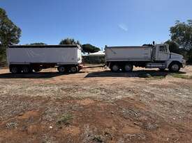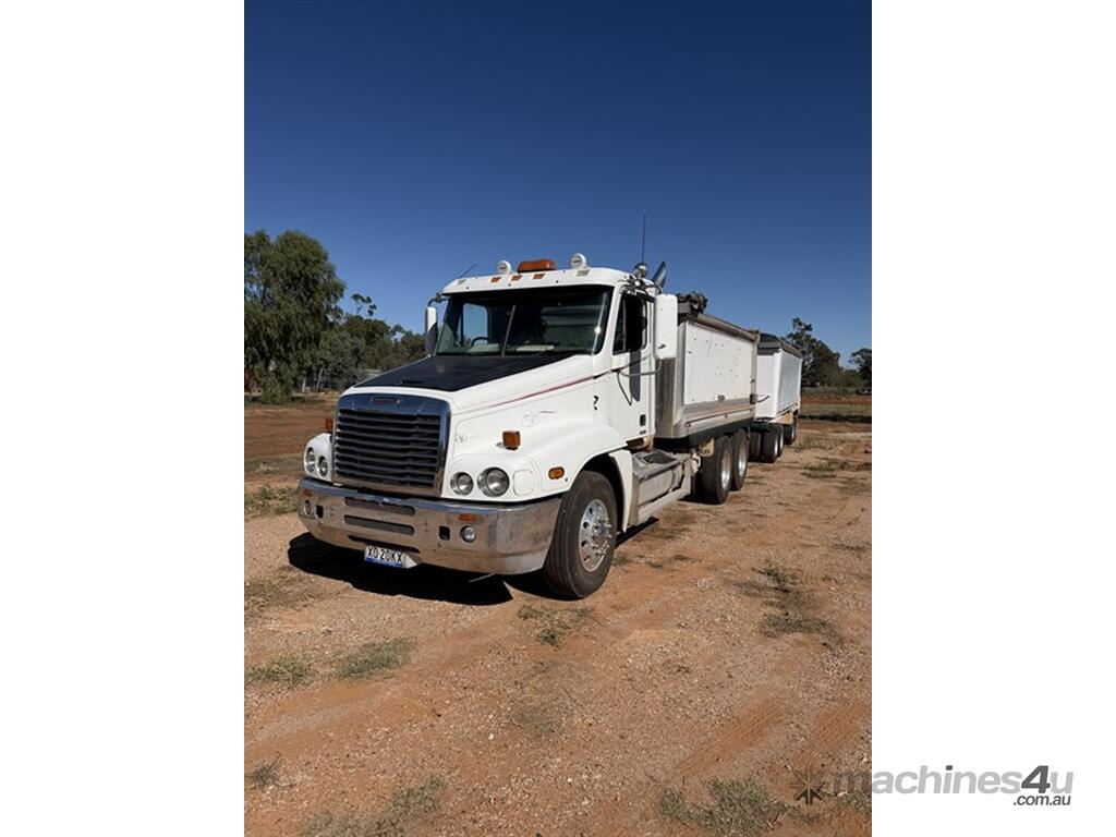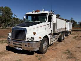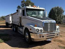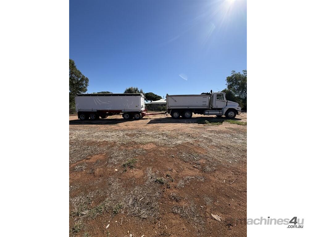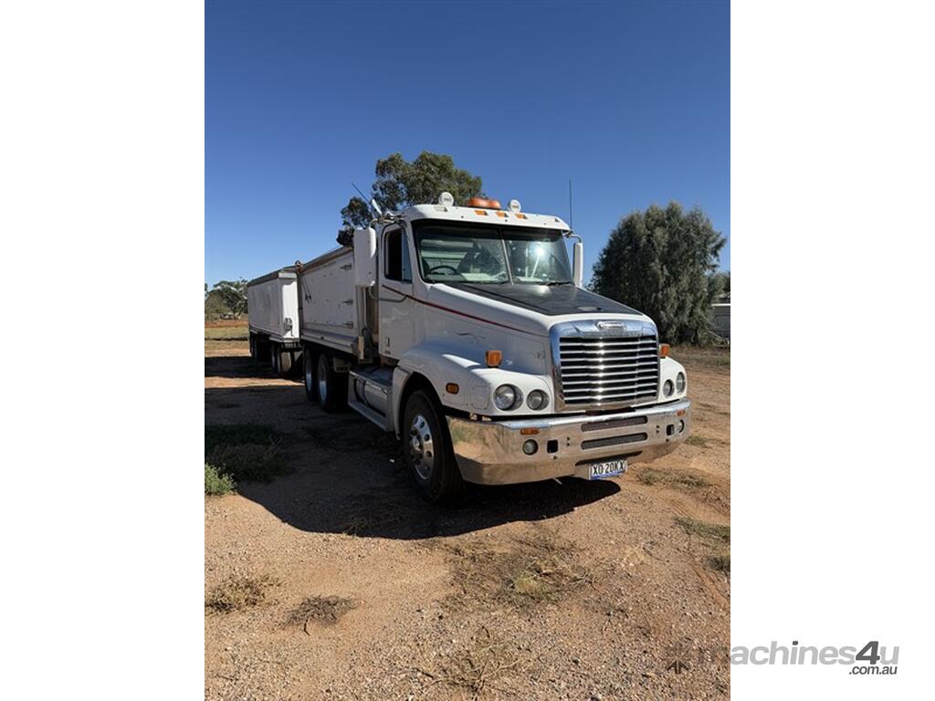 2008 Freightliner Century Class CST 120 with Quad Dog, VIN: 1FVJBBAVX9L999540. Registration XO20KX (expires 14/11/2026). GVM: 24,000 kg; GCM: 90,000 kg. Features Meritor diffs (4.30), CATERPILLAR C15 Acert engine NXS32223, New "HYDRECO" hoist, and Airliner suspension and 10-stud alloy rims. The alloy bin has lined walls and a steel-lined floor, measuring 4.6m long, 1.41m high, and 2.46m wide, equipped with electric roll-back tarps. Includes a two-way rear door with grain chute/door, air-operated tailgates,