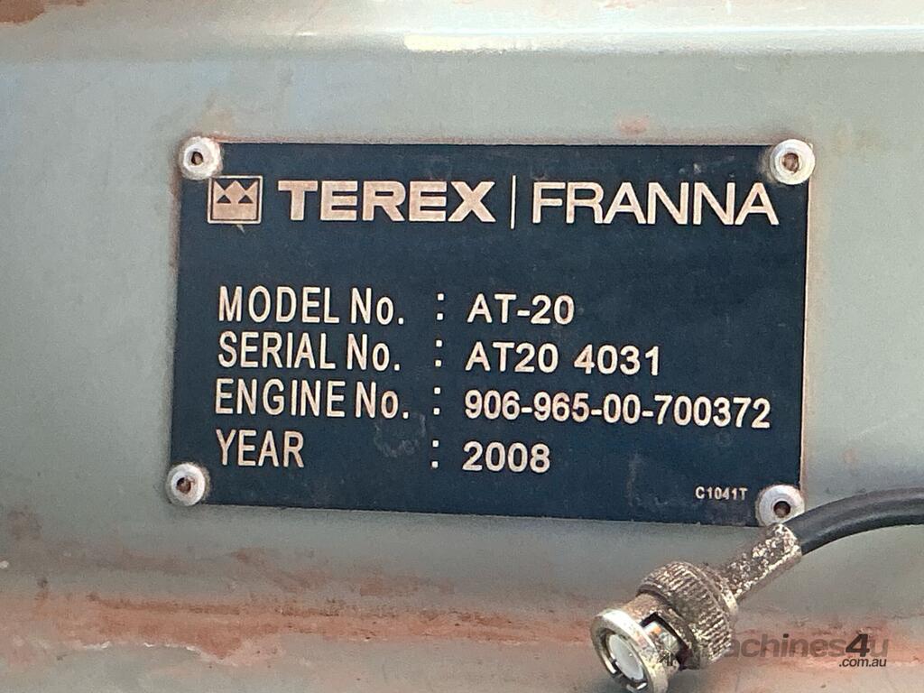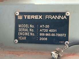 CP: CIRCA 2008,Franna,AT20,All Terrain Pick & Carry Crane,6.3 Ltr,6 Cyl,Diesel Turbo,39930 (Kms. Showing on Odometer),12898 (Hrs. Showing on Hour meter),Colour: Yellow,Rego. No: 1IAQ852 WA,Rego expiry: 30/05/2026,Serial No: AT20 4031,ROPS No: undefined,FOPS No: undefined,Plates to All,Key No: 559