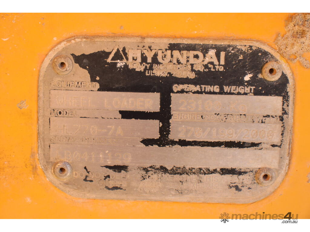 Wheel Loader, Make; Hyundai, Model: HL770-7A, DOM: 2008, Serial: LB0411129, Hourmeter: 6,397 Hrs Showing, Loadrite 2180 Load Scales, 3000mm Sand Bucket.