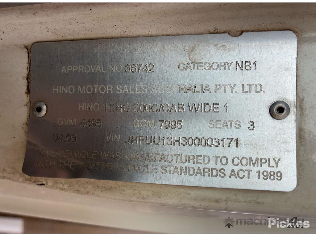 CP: 04/2008,Hino,300 616 ,Pantech,Manual,Spring,4 Cyl,Diesel,332092 (Kms. Showing on Odometer),Hourmeter not visible,Colour: White,Unregistered,VIN: JHFUU13H,Key No: 38,GVM: 4495,GCM: 7995,Sold with No Plates,Key No: 38