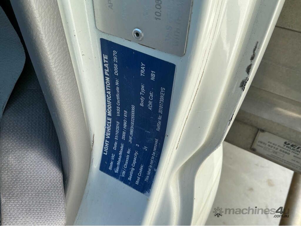 CP: 10/2008,Hino,300 series,Table Top,Manual,Leaf Spring Suspension,4 Cyl,Diesel,Odometer not visible,Hourmeter not visible,Colour: White,Rego. No: 1OF2TL VIC,VIN: JHFJM03HX02000060,Length: 5 m,GVM: 4495,GCM: 7995,Sold with No Plates,WOVR Status: WOVR N/A,Incident Type: Impact