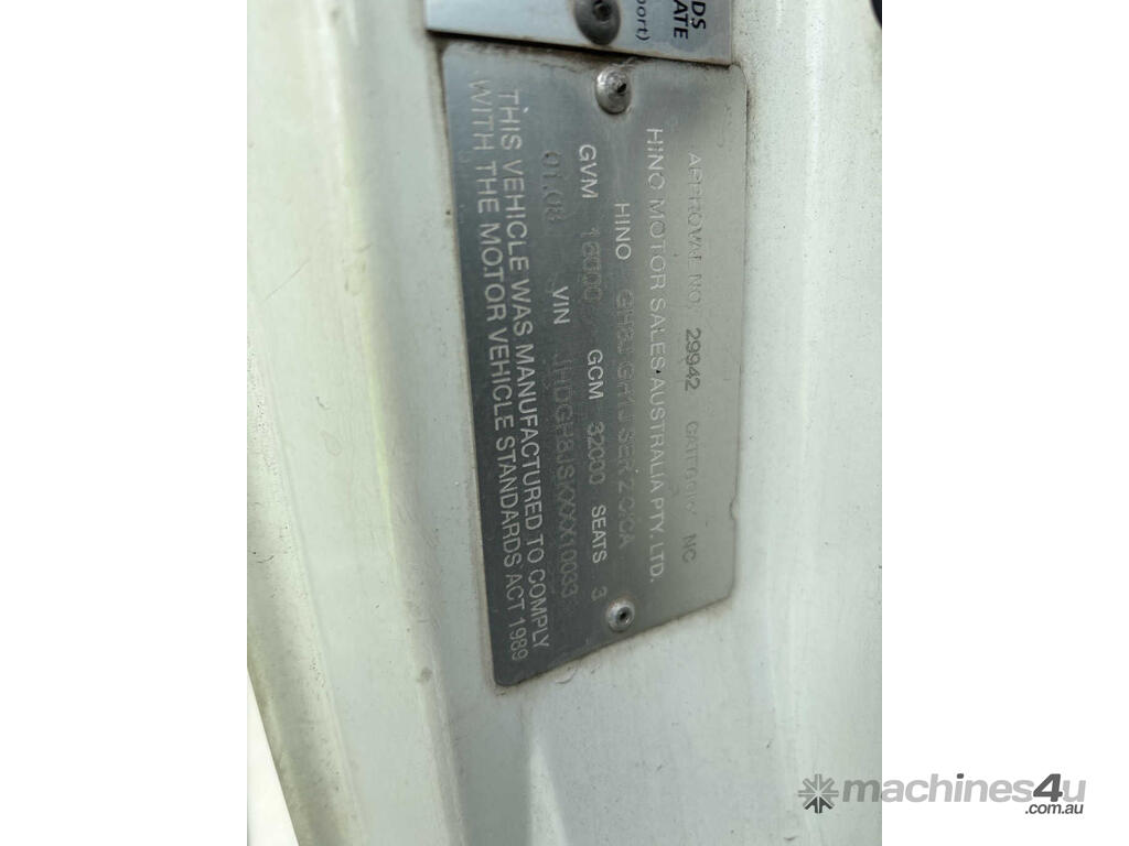 CP: 01/2008,Hino,500 1727 GH,Box Body,Manual,Diesel,Odometer not visible,Hourmeter not visible,Colour: White,Rego. No: NP(ZOY135), Unregistered VIC,VIN: JHDGH8JSKXXX10033,Length: 32 ft,GVM: 16000,GCM: 32000,Sold with No Plates,WOVR Status: WOVR N/A,Incident Type: Impact