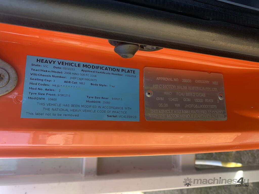 CP: 05/2008,Hino,FC4J,Beaver Tail,Manual,Spring,Diesel,5 Gears,306785 (Kms. Showing on Odometer),Hourmeter not visible,Colour: Orange,Unregistered,VIN: JHDFC6JJKXXX10075,GVM: 10400,GCM: 15000,Sold with No Plates