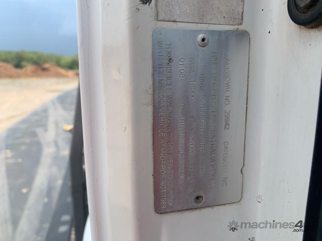 CP: 01/2008,Hino,GH 500,Tilt Tray,Manual,Airbag,Engine #: J08ETB13850,6 Cyl,Diesel,Intercooler Turbo,9 Gears,649641 (Kms. Showing on Odometer),Hourmeter not visible,Colour: White,Rego. No: NP(XB93SP), Unregistered NAT,VIN: JHDGH8JSKXXX10017,GVM: 22500,GCM: 32000,Sold with No Plates