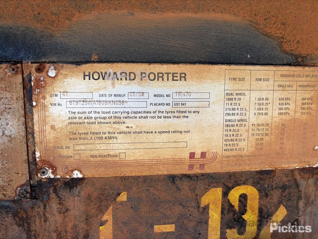 CP: 05/2008,Howard Porter,TRI470,Tri Axle Side Tipper,Hubometer not visible,Colour: White,Rego. No: NP(CGG6586), Unregistered WA,VIN: 6T9T25WA180BKN058,Sold with No Plates