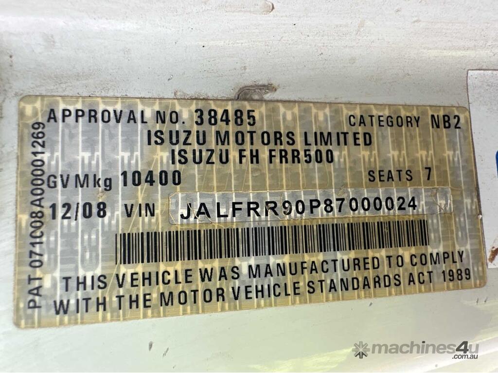 CP: 12/2008,Isuzu,FRR500,Flat Bed Tray,Manual,Leaf Spring Suspension,Engine #: 596476,Isuzu 4HK1,4 Cyl,Diesel,Turbo,6 Gears,186996 (Kms. Showing on Odometer),Hourmeter not visible,Colour: White,Rego. No: NP(BA93AP), Unregistered NSW,VIN: JALFRR90P87000024,Key No: 45,Length: 8.3 m,GVM: 10400,GCM: 16000,Sold with No Plates,Key No: 45