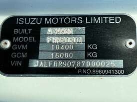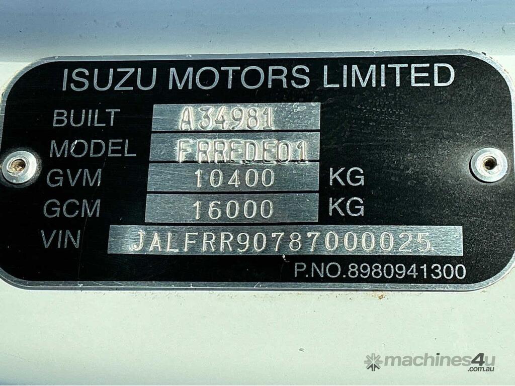CP: 01/2008,Isuzu,FRR500,Table Top,Manual,Spring ,Engine #: 4HK1589552,4 Cyl,Diesel Turbo,6 Gears,385960 (Kms. Showing on Odometer),Hourmeter not visible,Colour: White,Rego. No: AT96VD NSW,Rego expiry: 31/03/2026,VIN: JALFRR5,Key No: 406E,Length: 8.9 m,GVM: 10400,GCM: 16000,Sold with No Plates,Key No: 406E